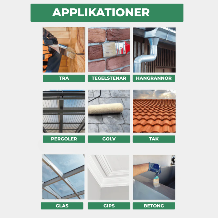 Fungerar på trä, betong, metall, glas, tak, tegel, hängrännor, fogar, badrumsanslutningar, sprickor, socklar, akuta reparationer och mer, utan att flagna eller förlora effektivitet över tid.